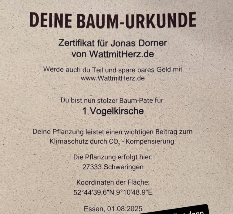Denn für jeden abgeschlossenen Vertrag pflanzen wir einen Baum – inkl. Baumzertifikat von Plant-my-Tree.de mit exakten Koordinaten. So kannst du jederzeit nachvollziehen, wo dein persönlicher Beitrag zur grüneren Zukunft wächst.